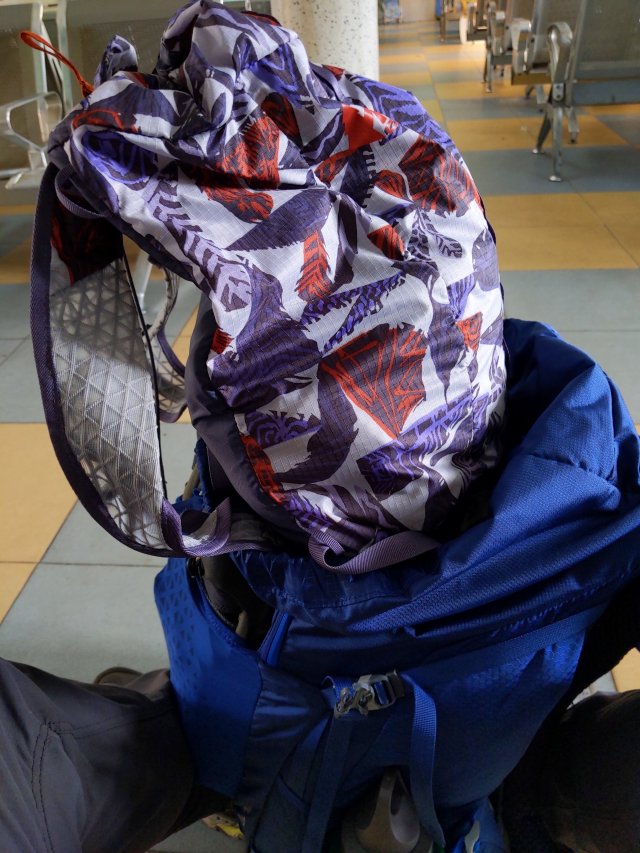 Inside my bag is… another bag! This cute purple one is my day pack, so that I don’t have to lug everything I own on little excursions. It’s quite comfortable, and is plenty big enough for a water bottle, a rain jacket, my e-reader and a snack.