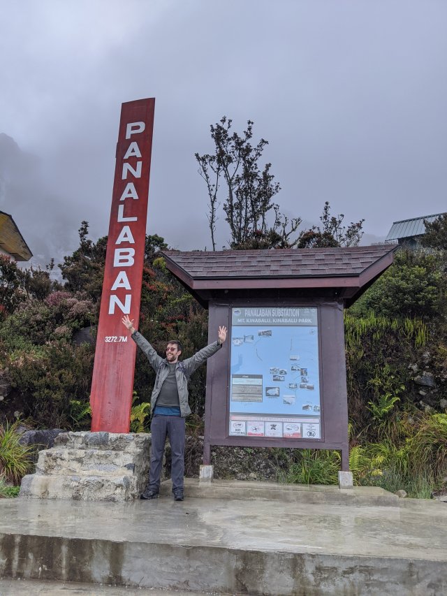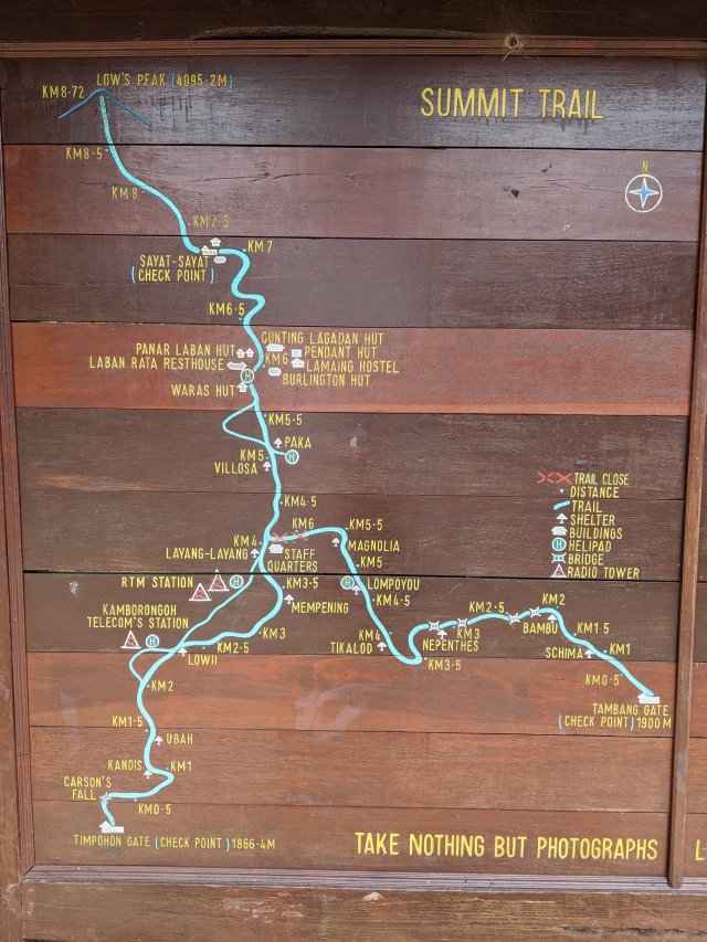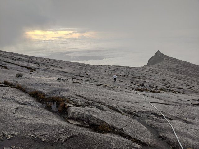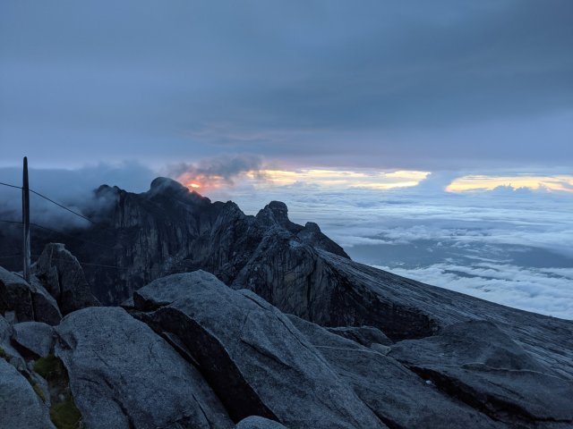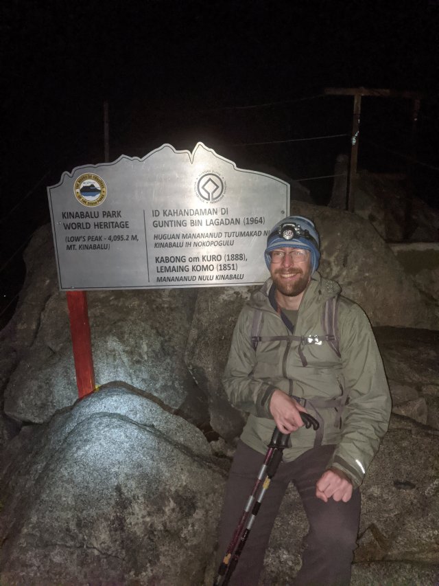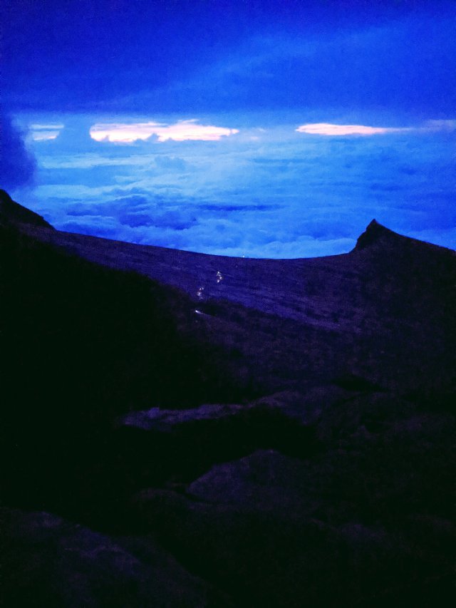 The clouds had cleared overnight, giving us a beautiful full moon to aid our headlamps, and the pre-dawn climb was quite peaceful. I had acclimated after the long rest at elevation, and though I was breathing harder than normal I wasn’t gasping. Again I sped ahead of the rest of my group, passing many Malaysians struggling up the steep route to the top. At around 5:25 I was in the first cluster of hikers to summit, half an hour before dawn. 4095 meters, just 8.5 km from the trailhead.